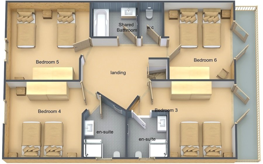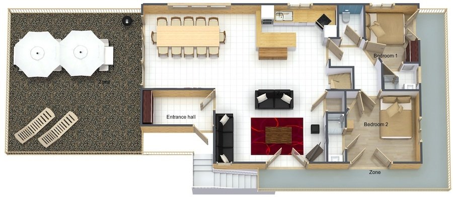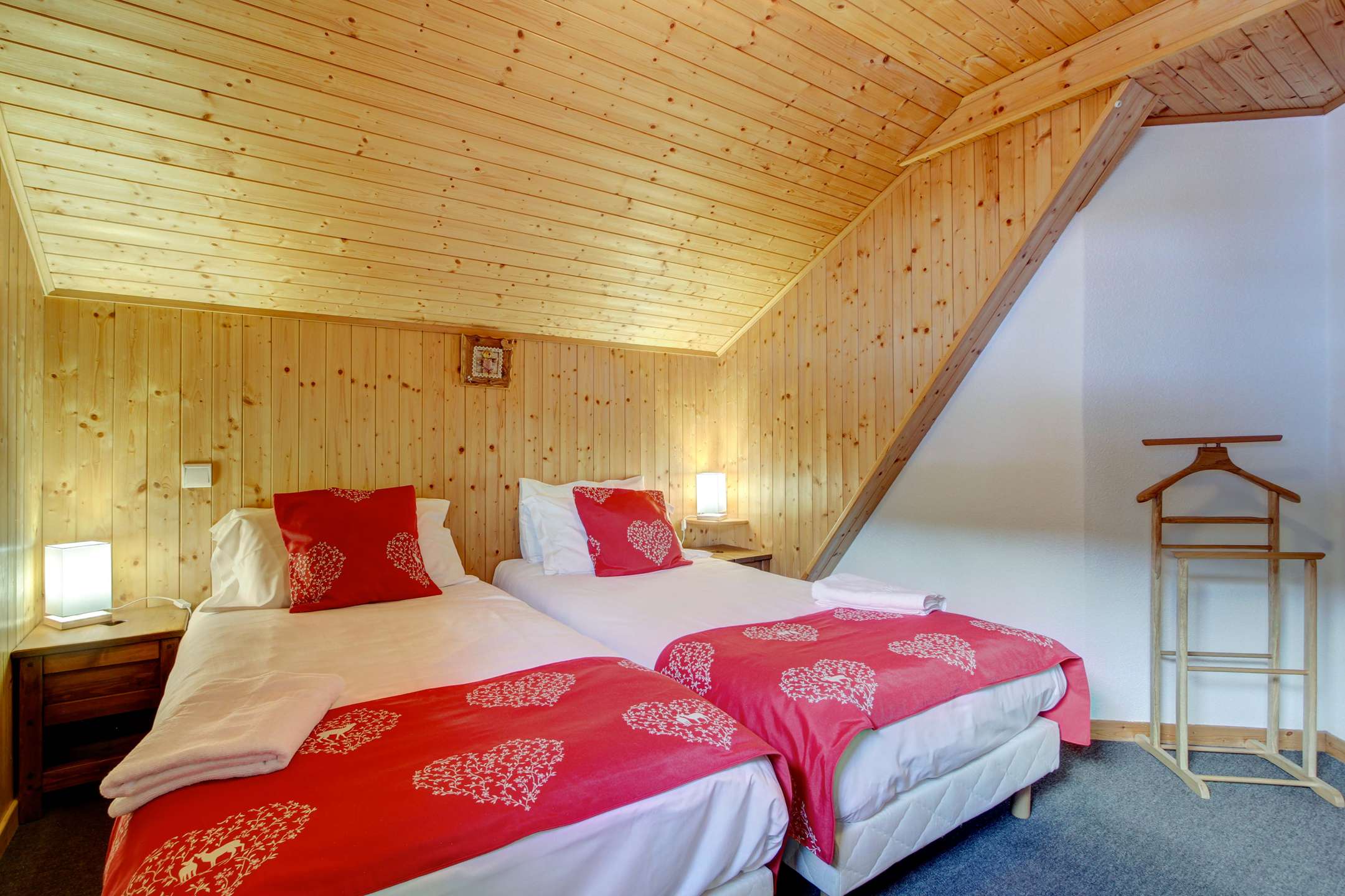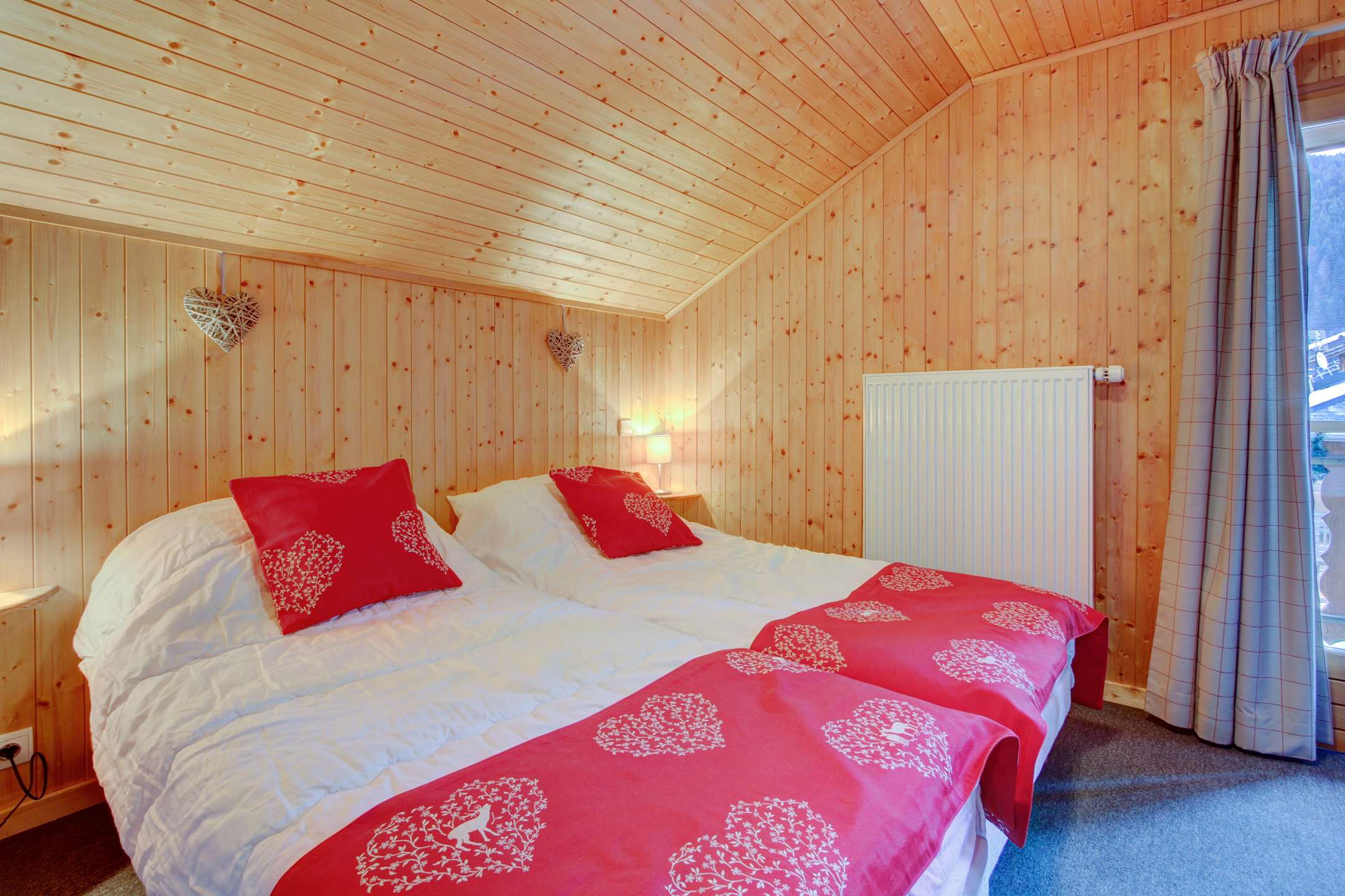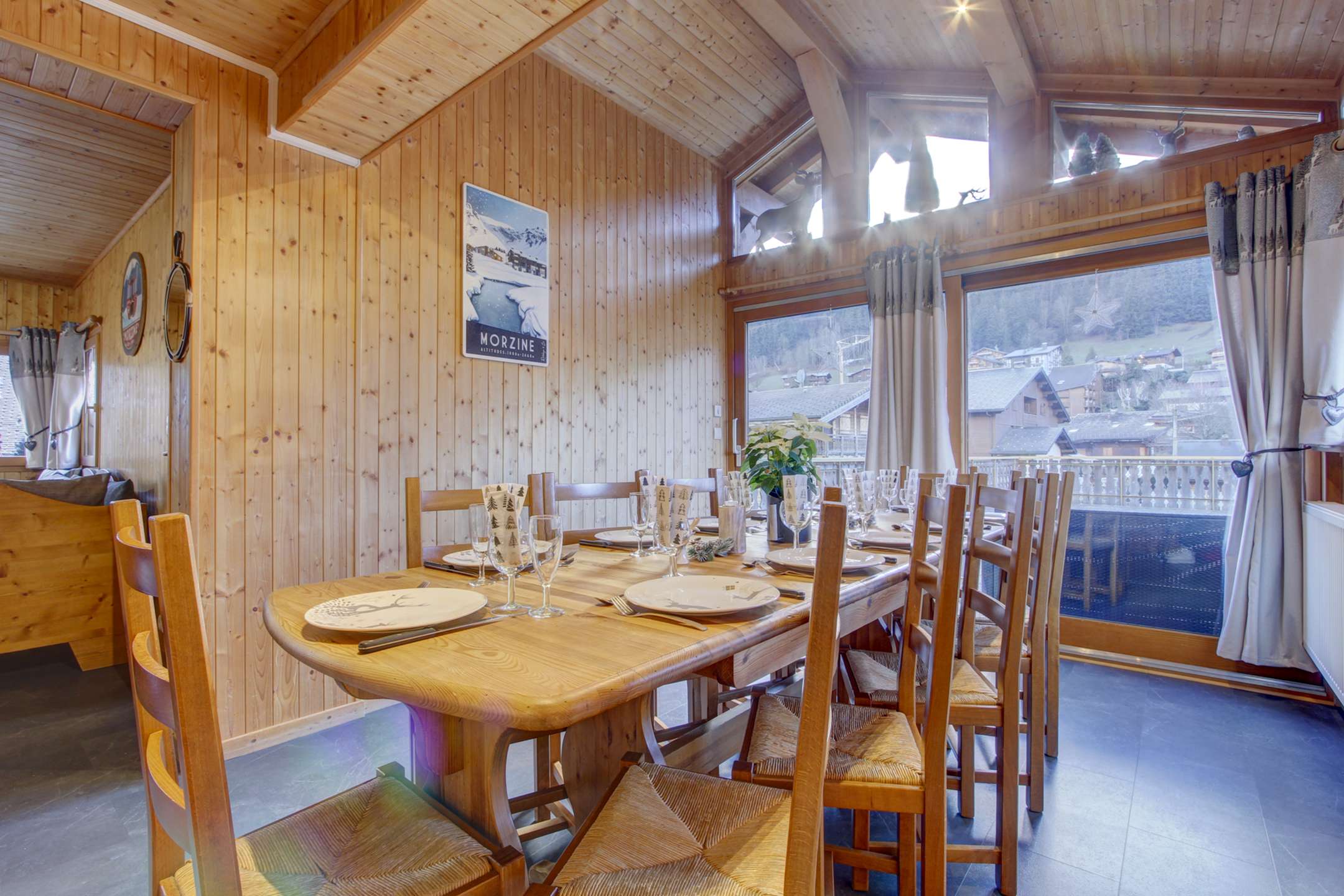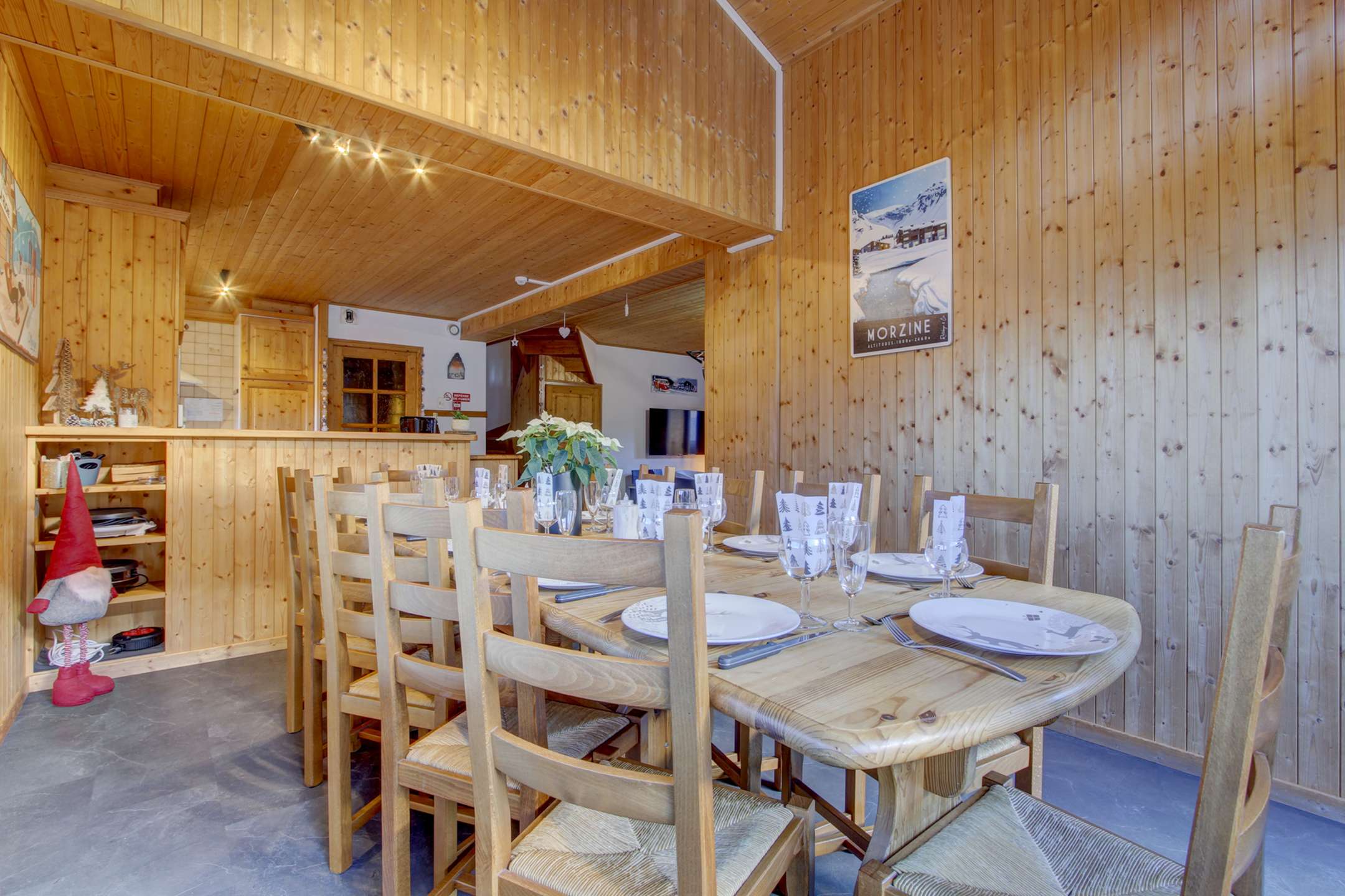 Close to the village centre and near a free ski bus stop, this big duplex apartment can accommodate up to 12 people. It is at the 1st and 2nd of a lovely chalet comprising: