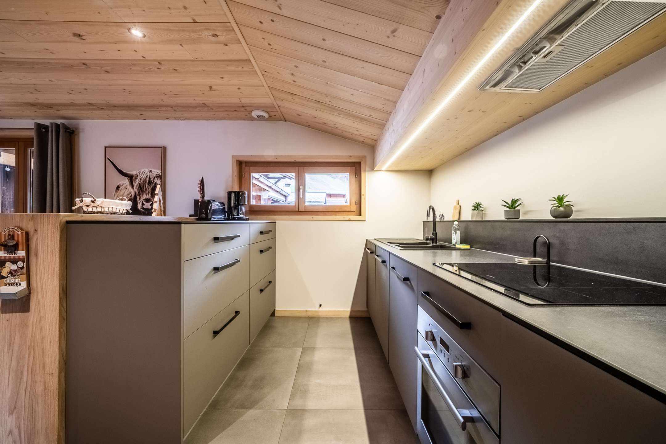 - vaste pièce à vivre avec superbe vue, cuisine ouverte toute équipée avec coin repas et accès à la terrasse couverte, coin salon avec canapé convertible(140x190), télévision, poêle à bois et accès balcon