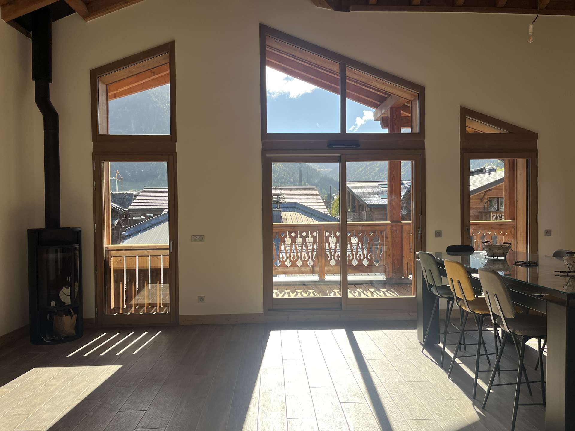Belle pièce à vivre avec vue sur les sommets, cuisine ouverte entièrement équipée, coin repas, accès à la terrasse exposée sud, salon avec poêle à bois, télévision francaise et internationale