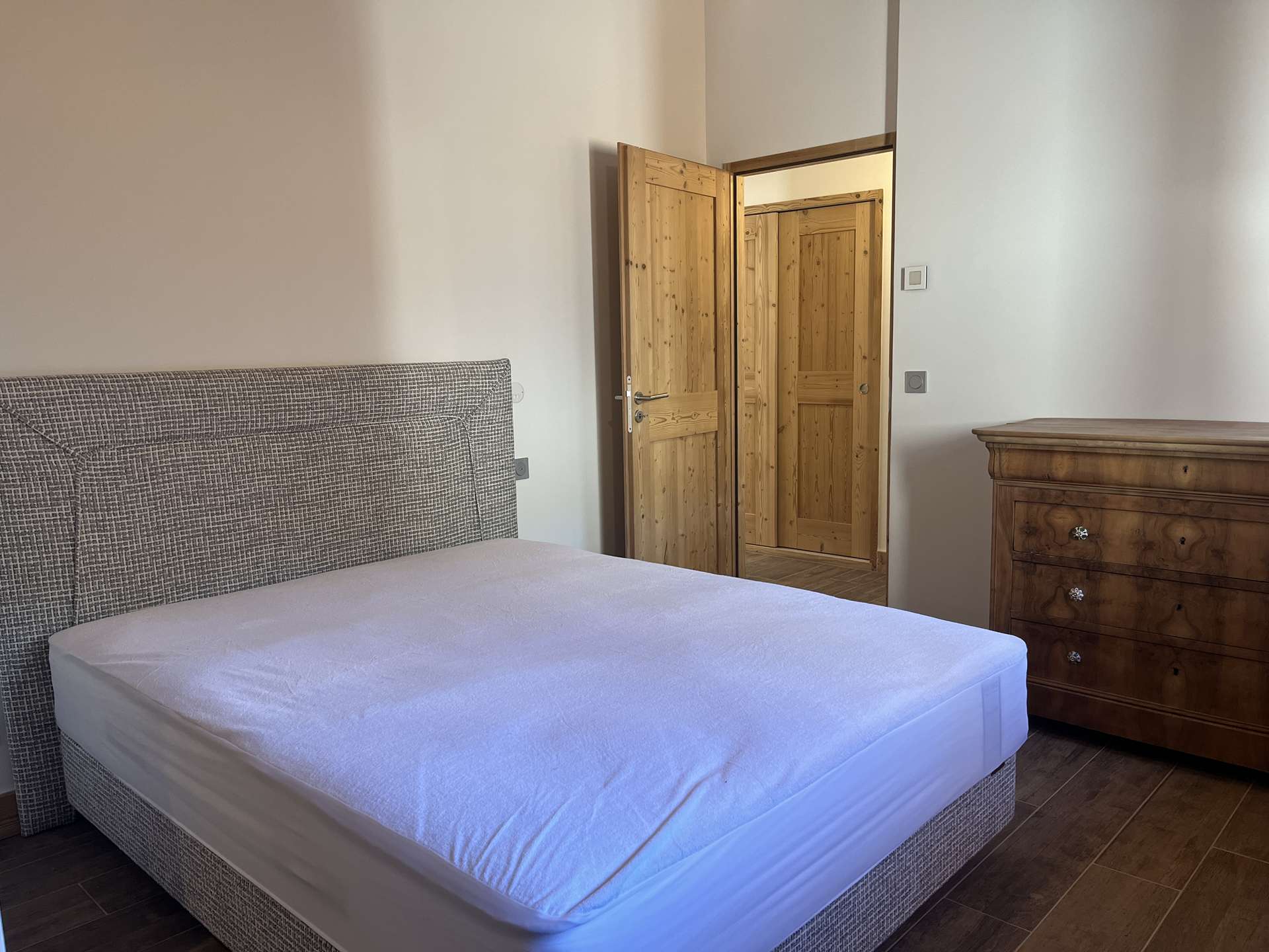 Chambre 1 : un lit double, rangements, salle de douche attenante avec WC