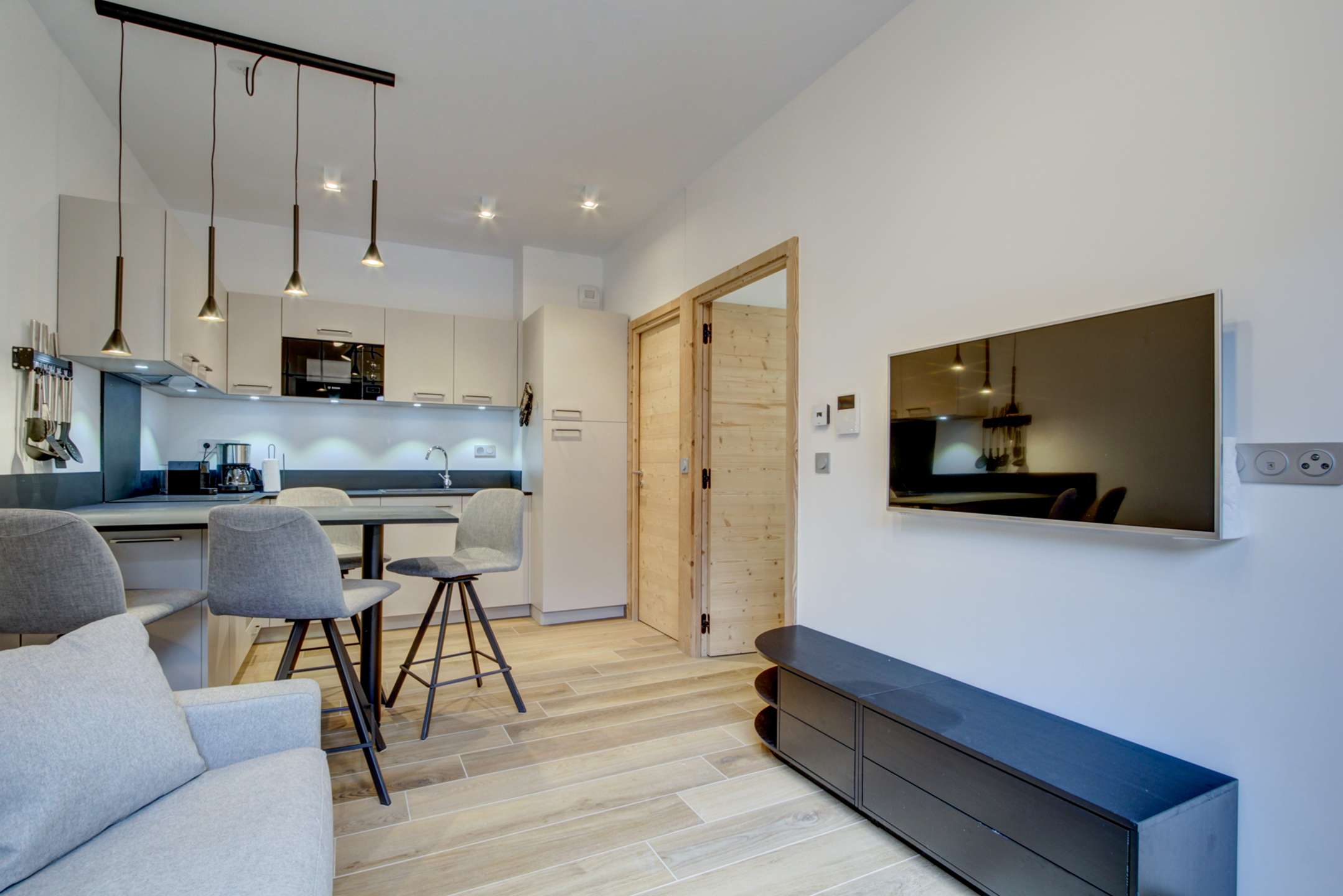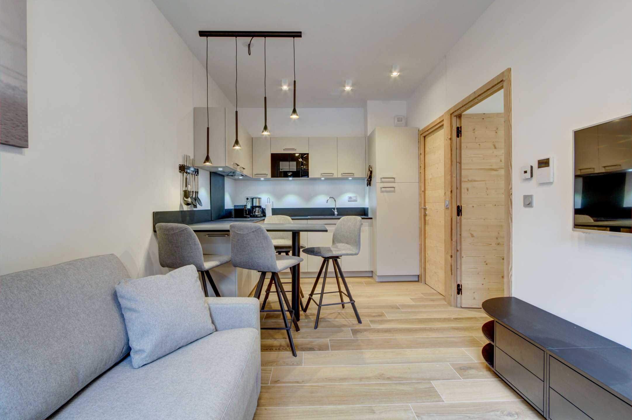 Pièce à vivre avec cuisine équipée ouverte sur le séjour avec coin repas, canapé convertible et télévision