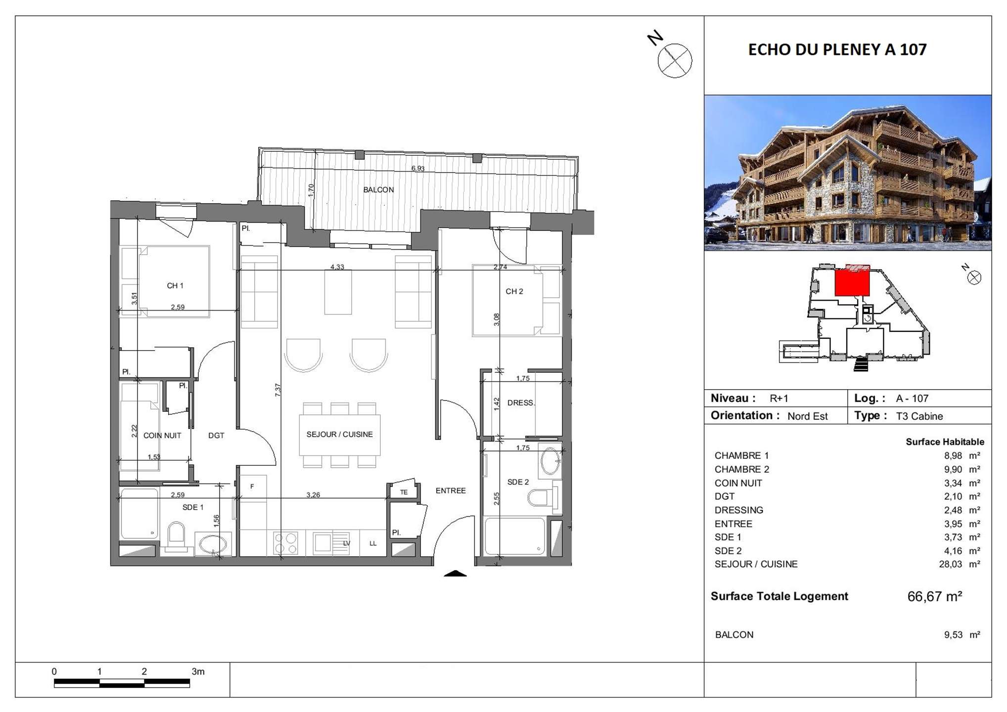 Echo du Pleney A107 est un appartement deux chambres + cabine au coeur de Morzine au 1er étage d'une résidence neuve avec ascenseur. Proche de toutes commodités et à 500m des pistes de Morzine, ce spacieux appartement de 66m² se compose ainsi: