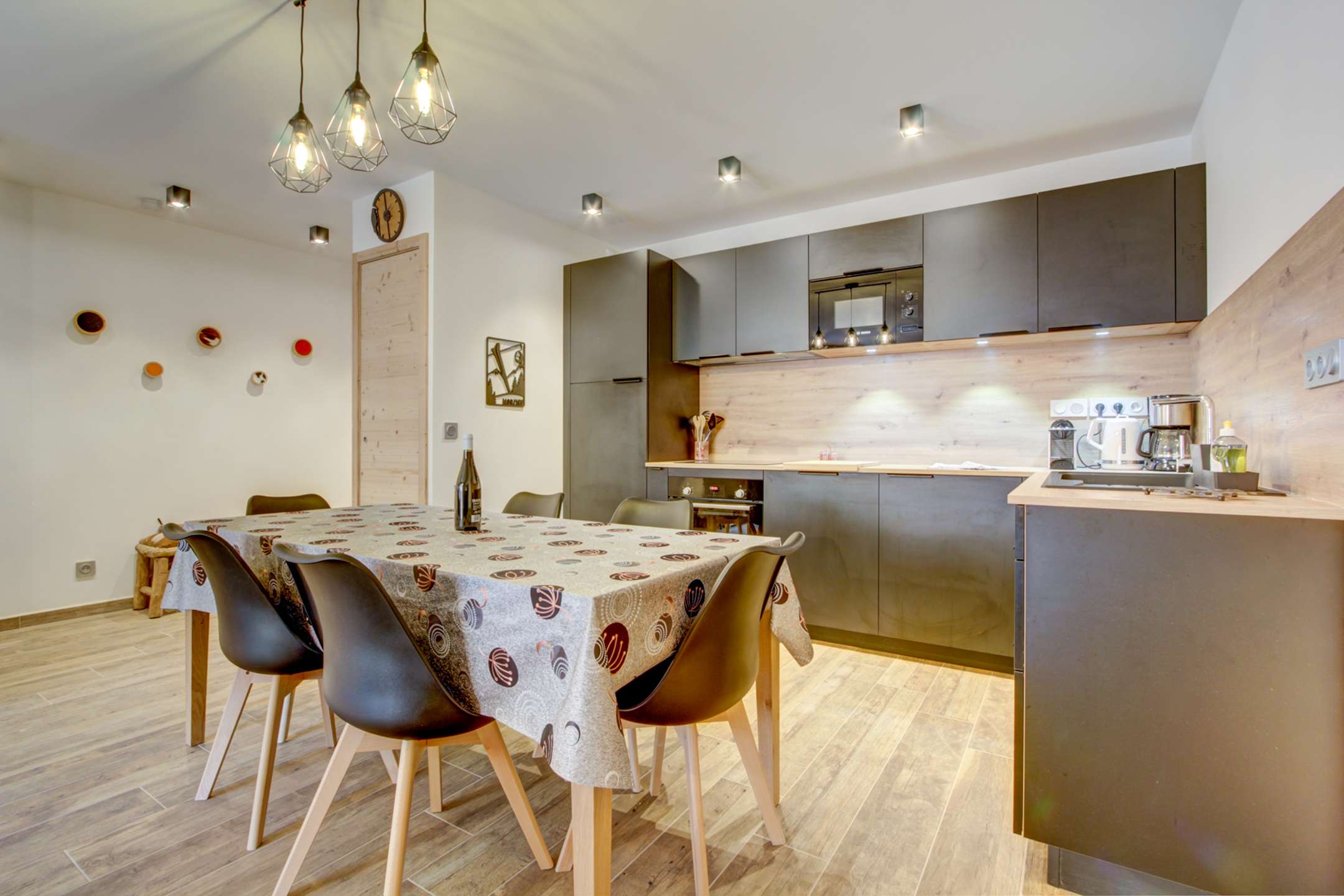 - belle pièce à vivre avec cuisine ouverte équipée, coin repas, salon avec canapé-lit pour 2 personnes et accès terrasse avec vue sur Super-Morzine