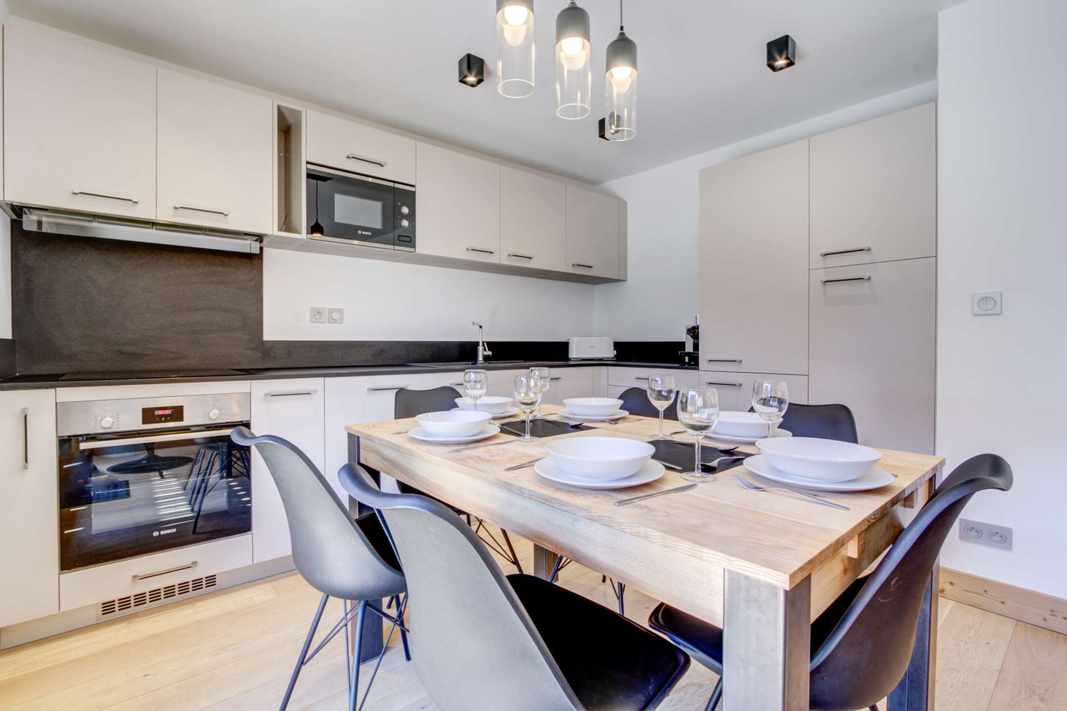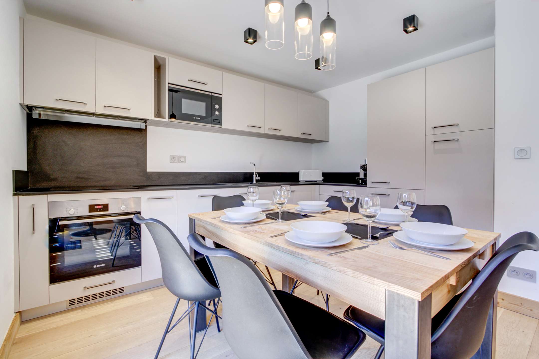 Pièce à vivre avec cuisine ouverte et totalement équipée, coin salon avec TV, coin repas et accès à la terrasse avec vue sur les pistes du domaine Morzine-Les Gets.