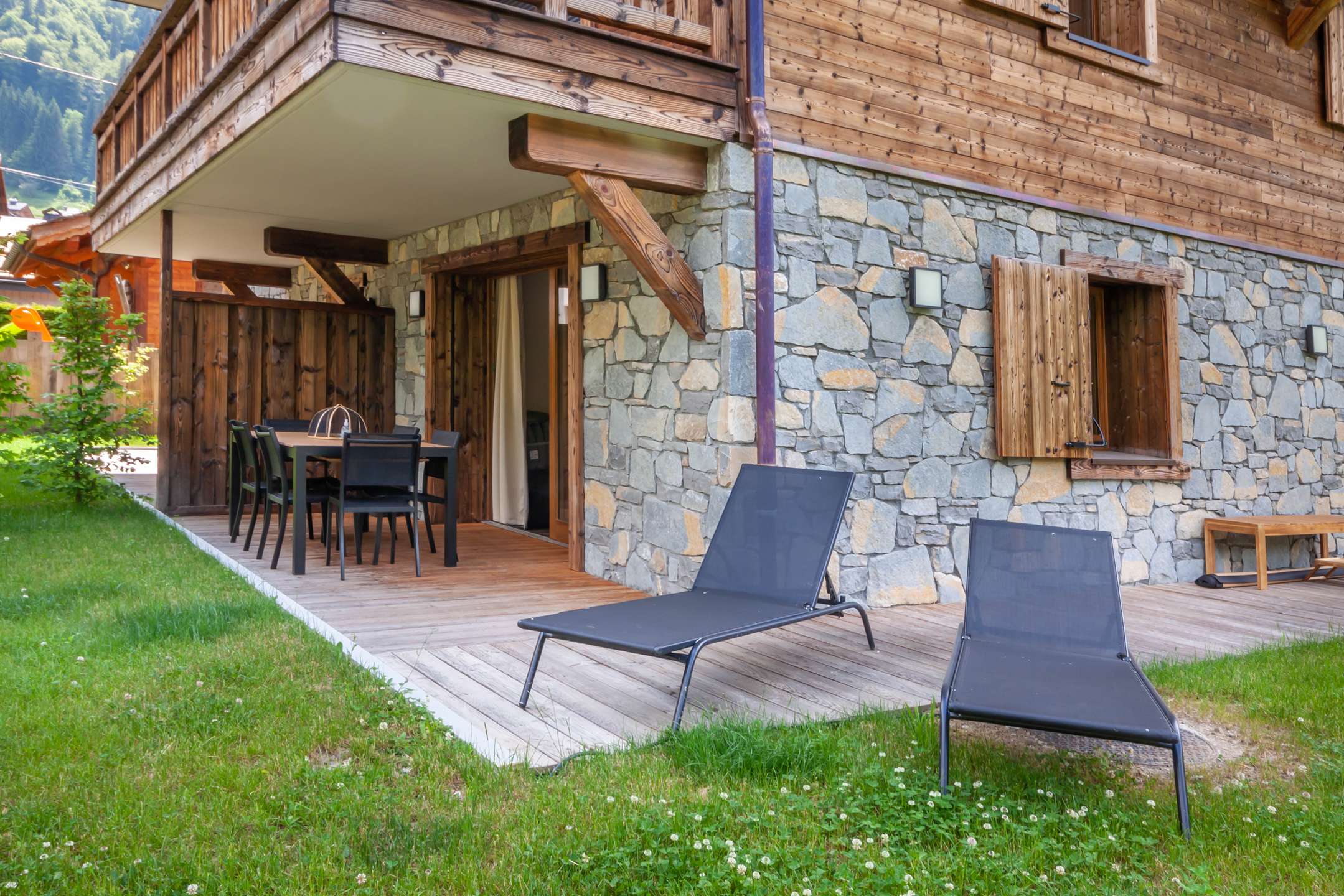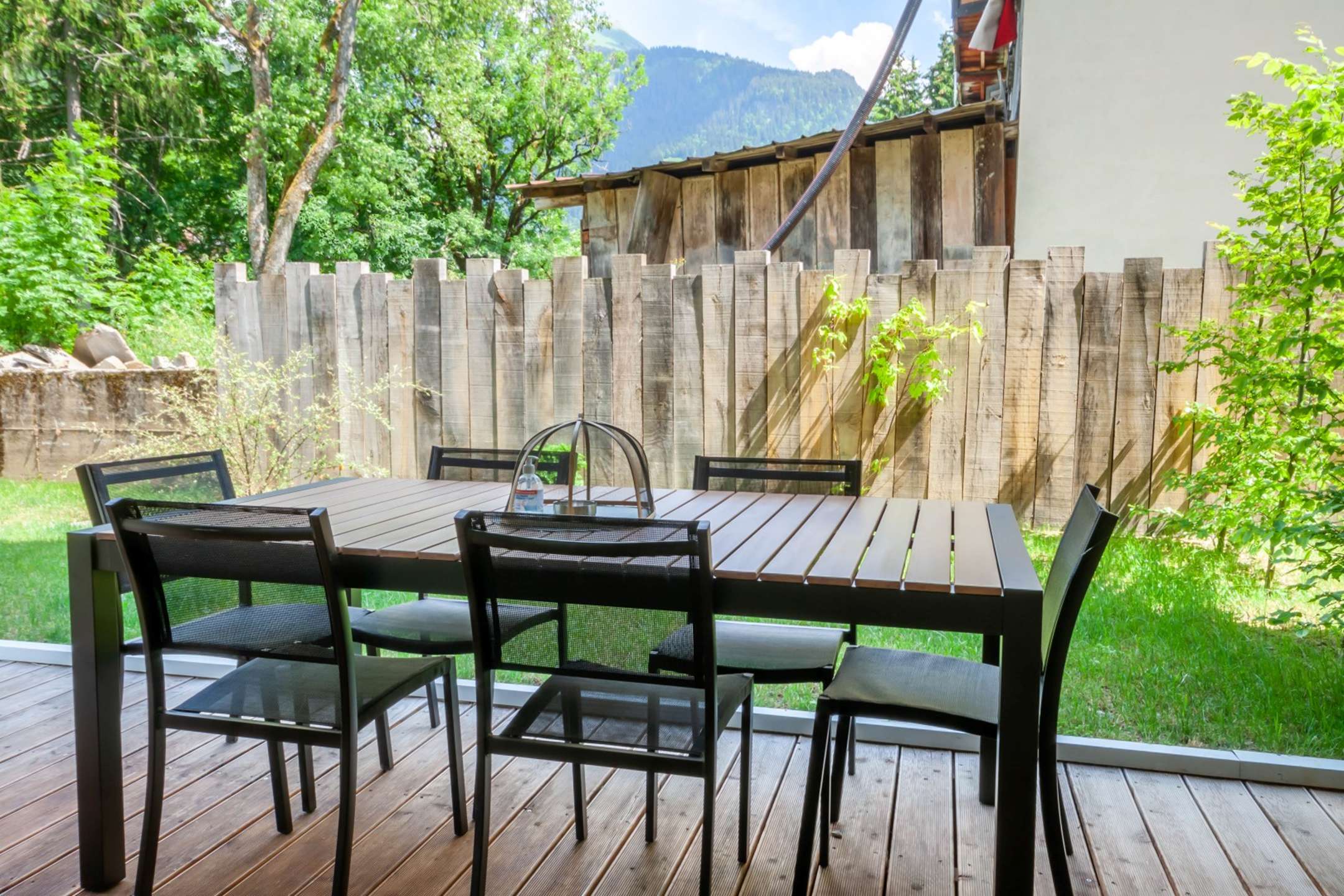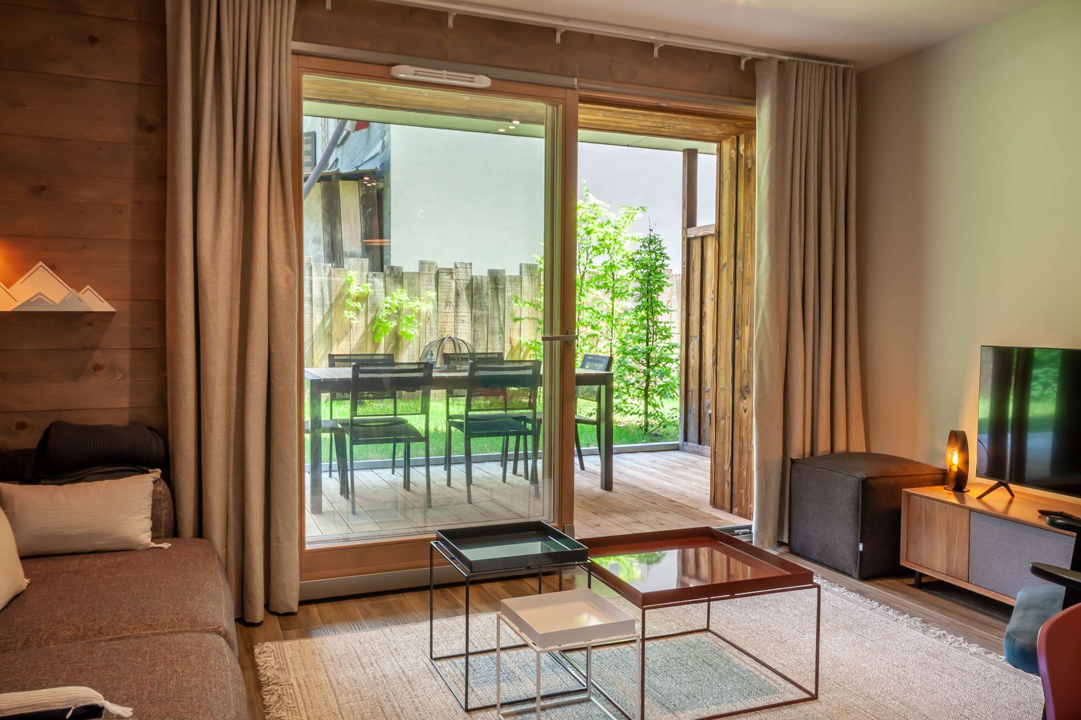 - Pièce à vivre avec coin cuisine ouverte sur le salon/séjour, terrasse avec jardin, vue dégagée sur les montagnes