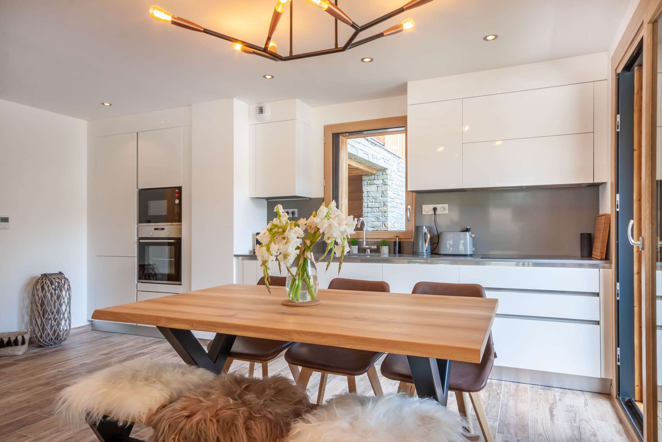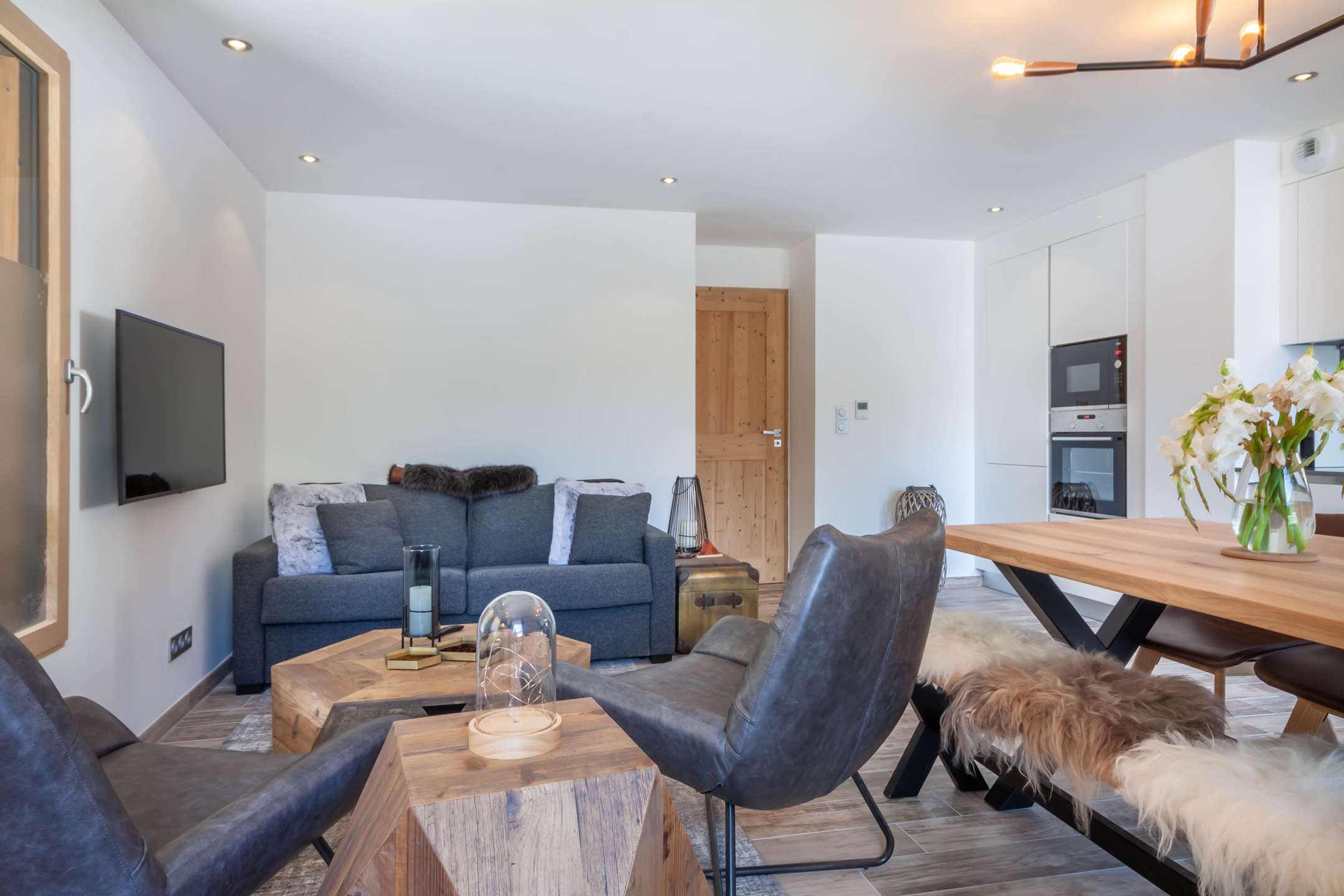 - grande pièce à vivre avec salon, cuisine ouverte et coin repas