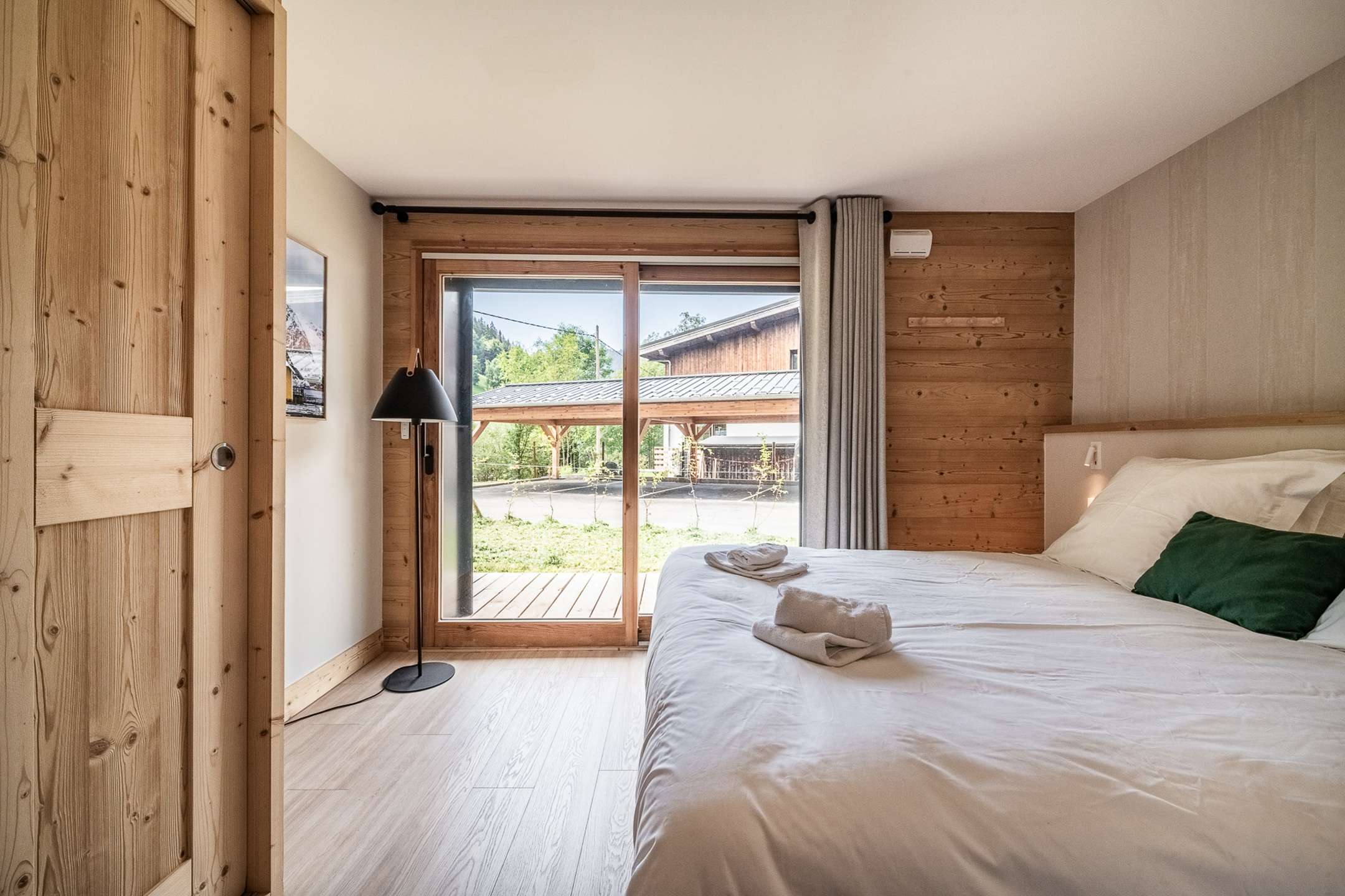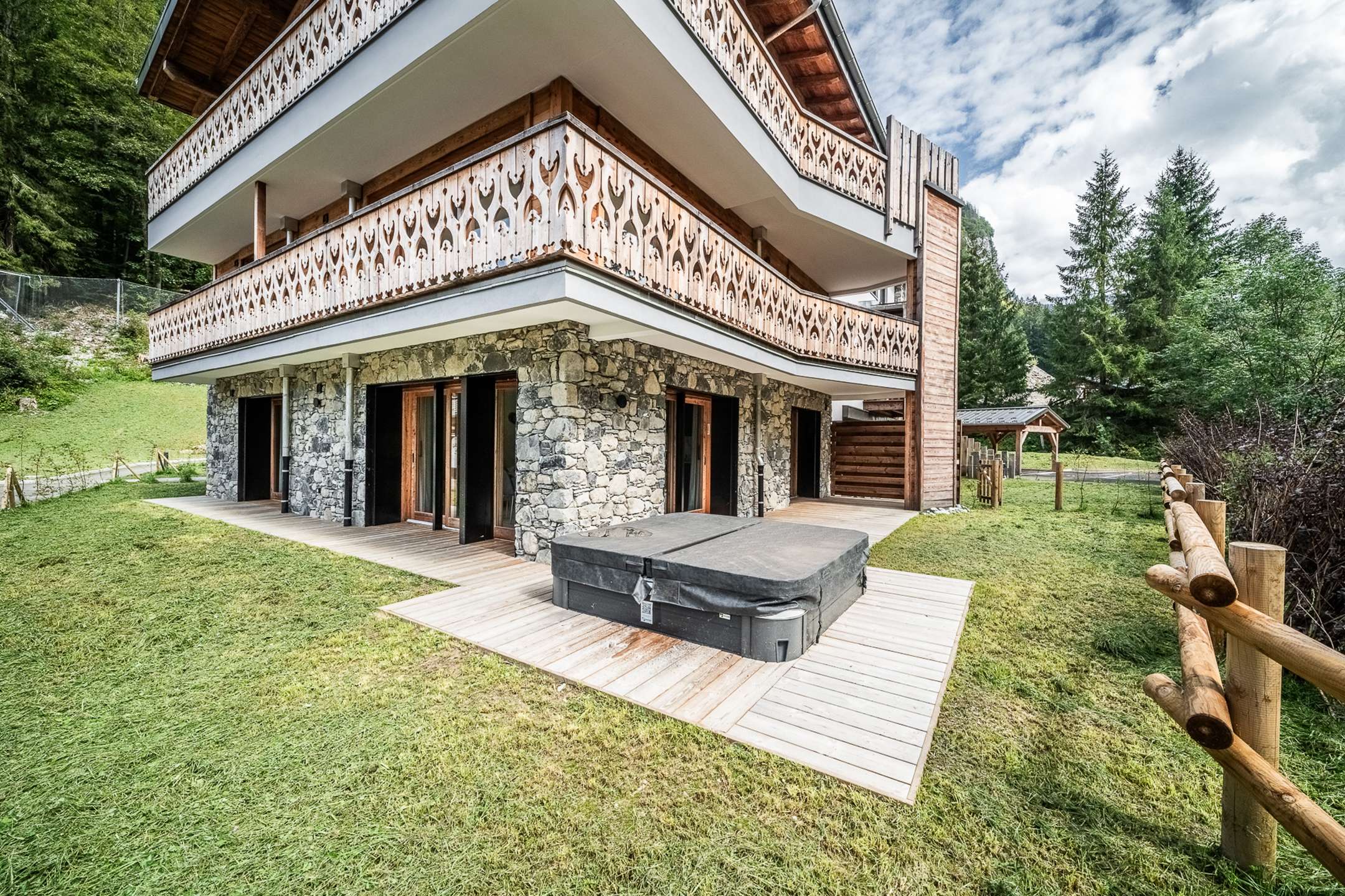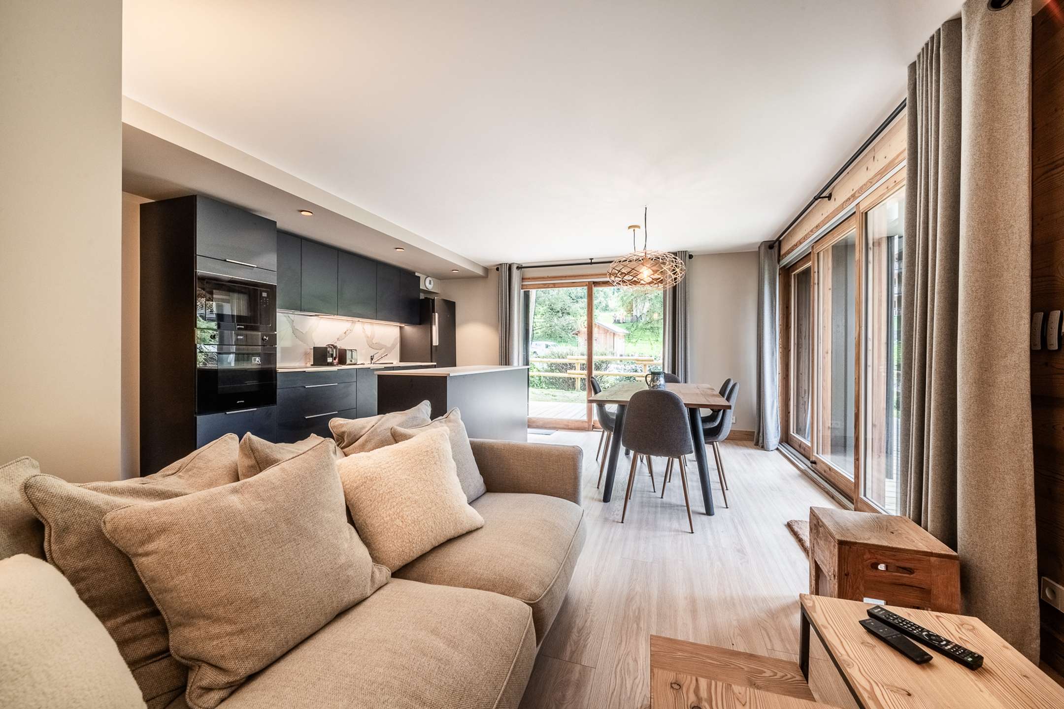 CHALET PASCAL A02 is a 74m² apartment with three bedrooms and two bathrooms, on the ground floor of a brand new building with a private garden and hot tub.