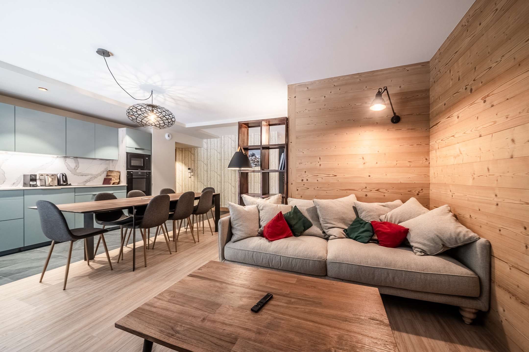 - Open living space with equipped kitchen, dining area, lounge area with sofa, television, access to balcony