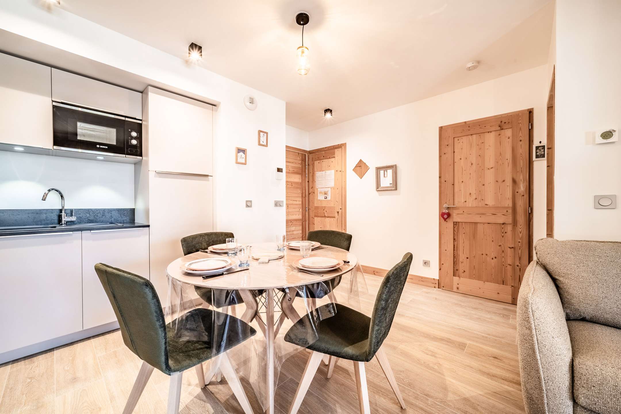 Cosy living area with balcony, equipped open kitchen, dining area and lounge area with sofa-bed (140x190), TV with French and international channels.