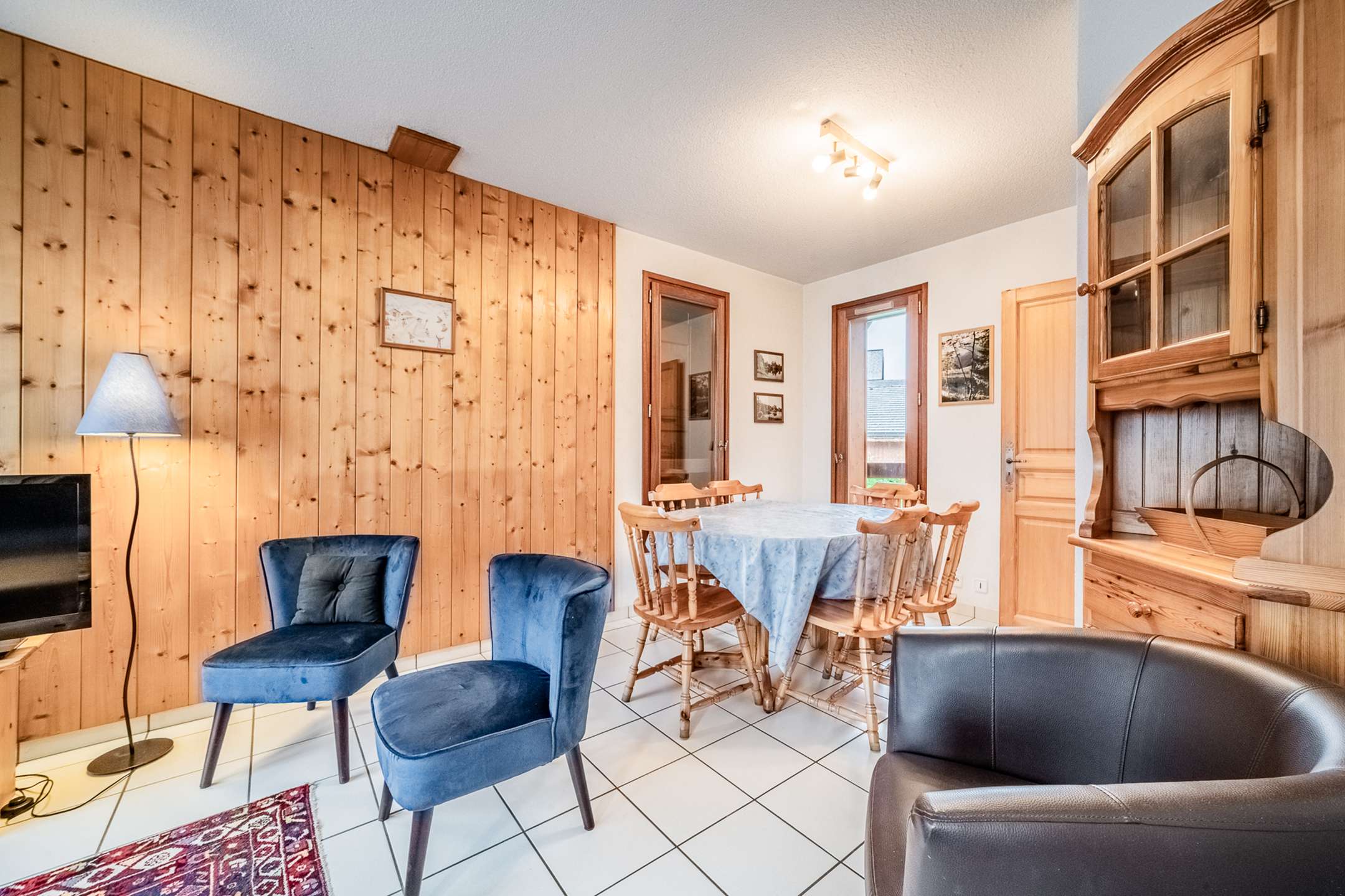 - large living room with open & equipped kitchen, balcony overlooking the slopes, dining area, lounge area with sofa and television