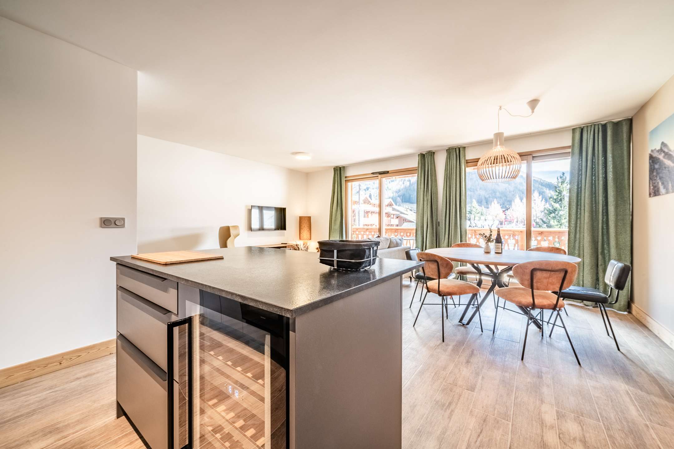 Lovely living space with open and fully equipped kitchen, dining area and lounge corner with TV sofa bed, access to the terrace to enjoy the view on the mountains and village.