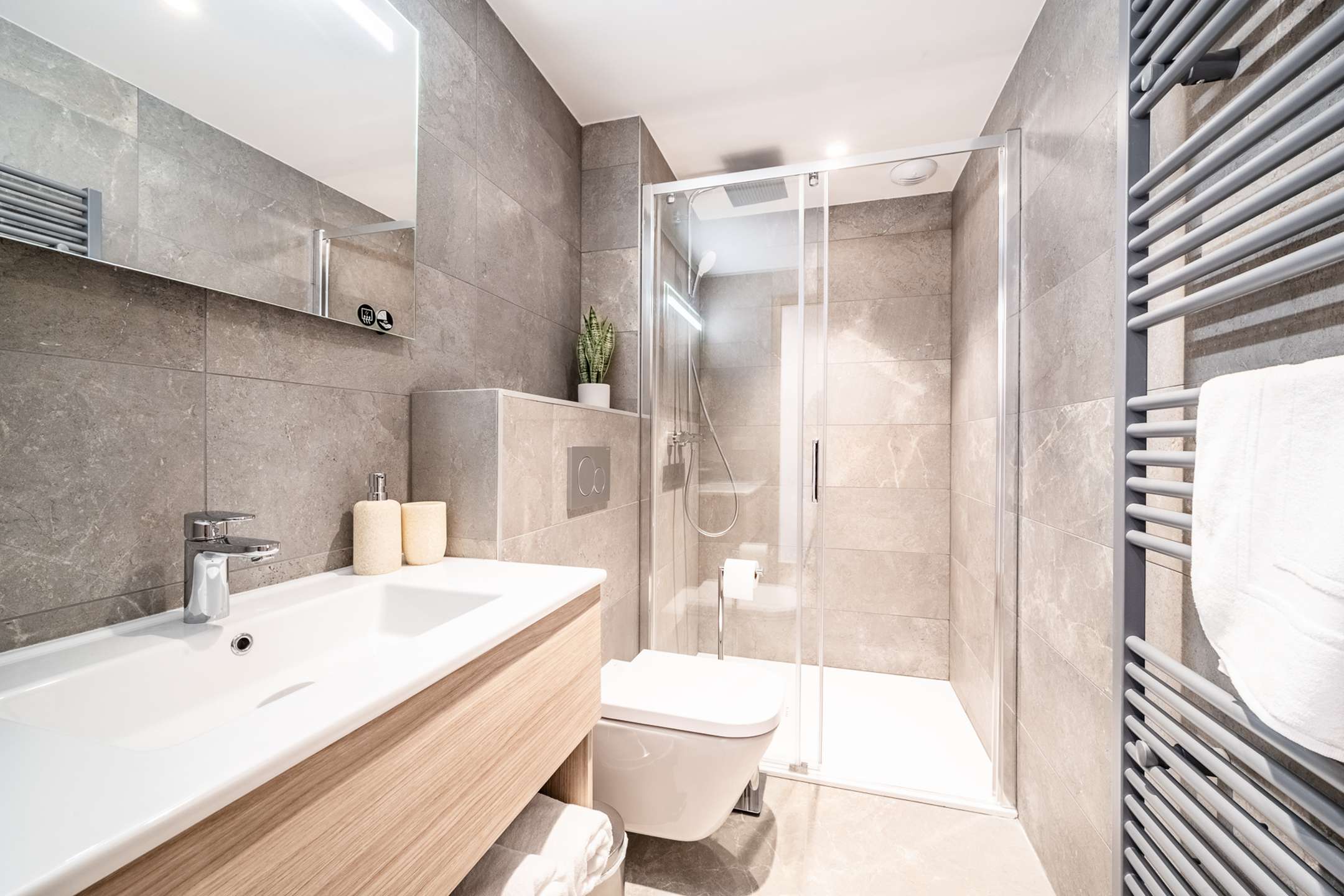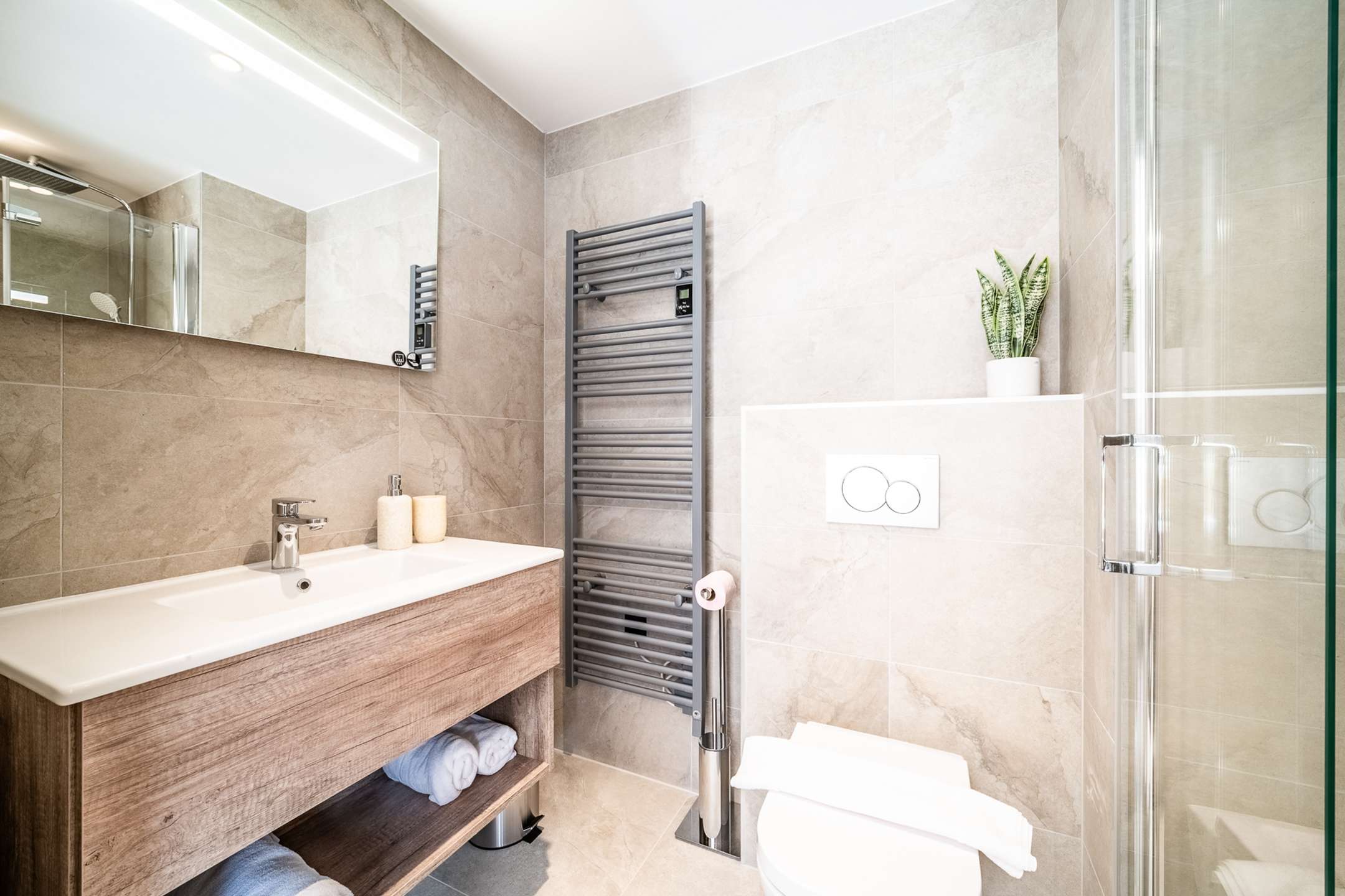 Bedroom 1 and 2 with two single beds (80x200) or one double, both with ensuite shower room + WC