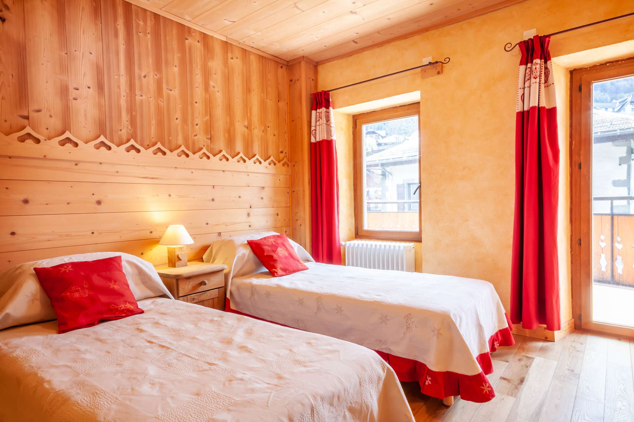 - bedroom with two single beds, storage and access to the terrace