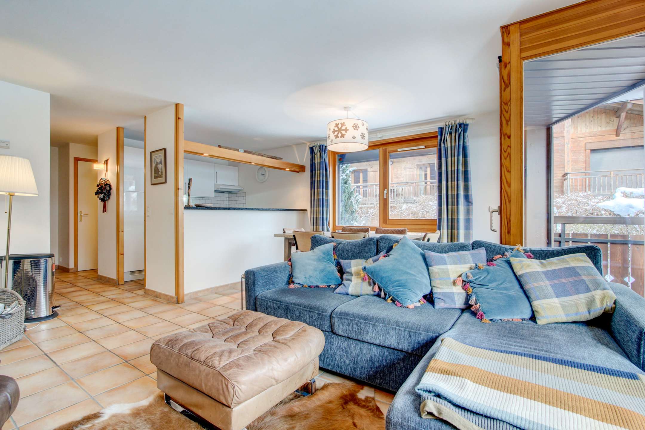 The open plan living area is south facing and has plenty of light, and a fireplace for cosy winter evenings. It opens up onto the covered terrace and the private garden.