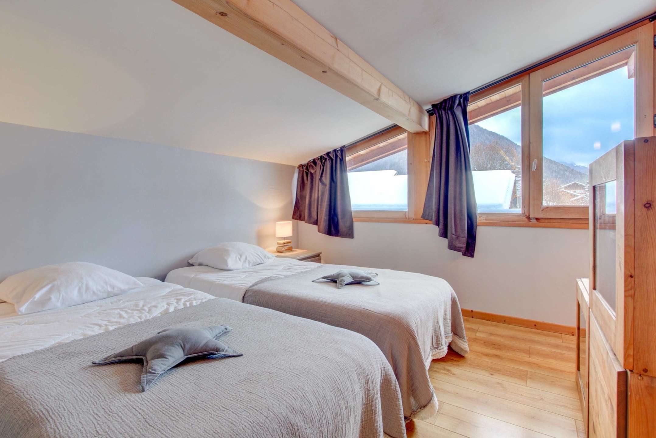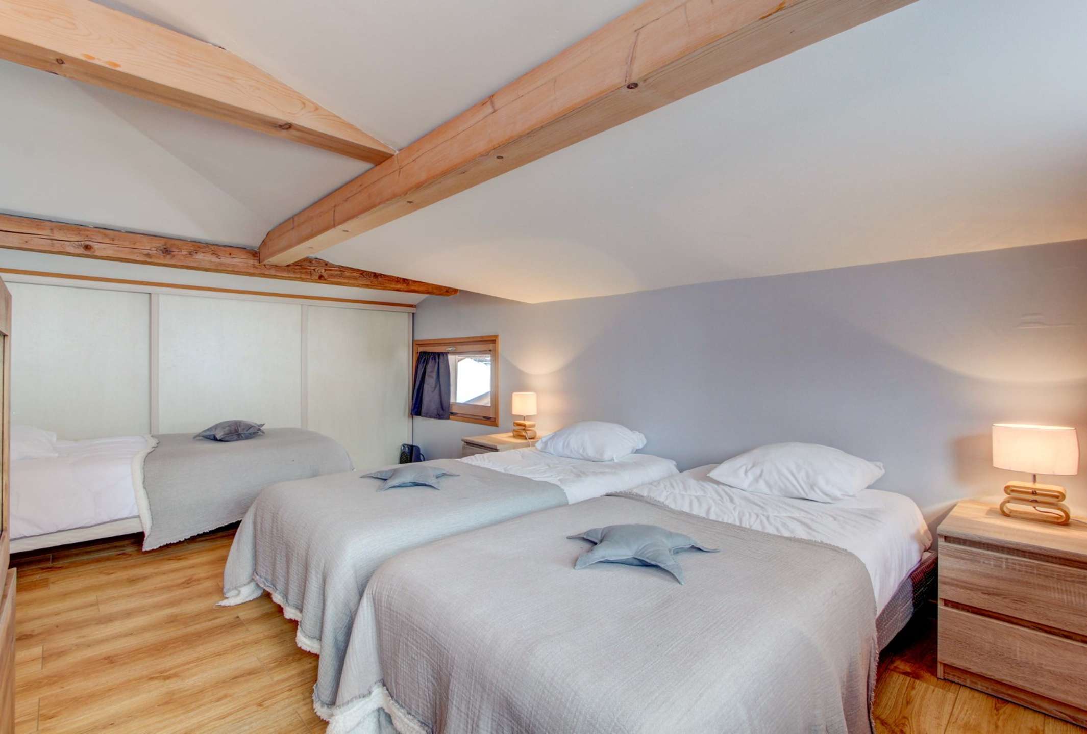 - bedroom with 3 single beds and a mezzanine with sofa-bed for two